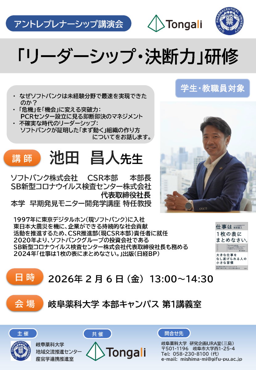2/6にアントレプレナーシップ講演会を開催いたします。岐阜薬科大学アントレプレナーシップ教育講演会として「『リーダーシップ・決断力』研修」をテーマに、ソフトバンク株式会社 CSR本部 本部長 池田昌人先生にご講演いただきます。