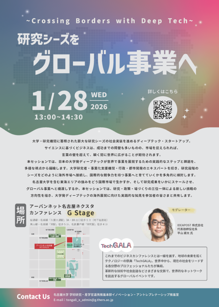 We will also discuss how the strengths of Nagoya University and the broader Tokai region can be leveraged in global markets, and what it takes to scale research outcomes into sustainable, international ventures. Through the combined perspectives of research, policy and ecosystem development, this session aims to outline new directions for global expansion and share actionable insights for advancing Japanese university-originated deep tech onto the world stage.
