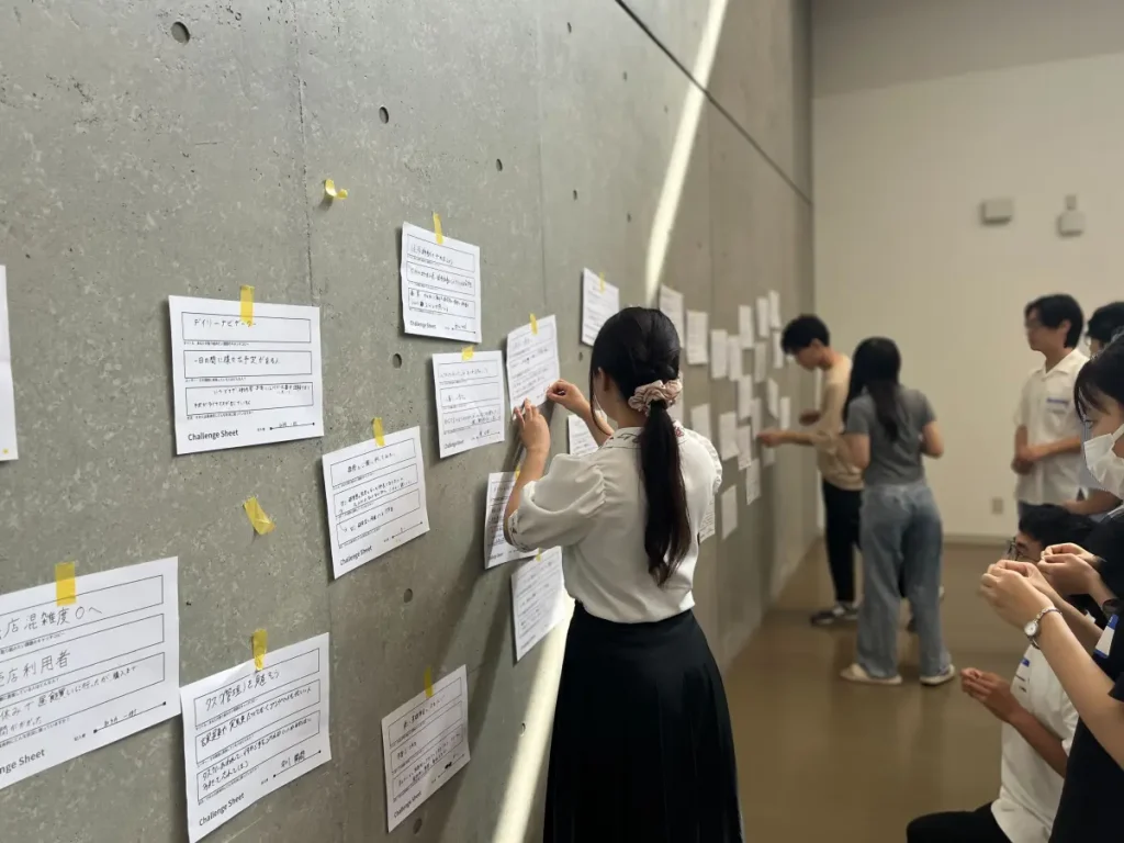 特に印象に残ったのは、「問題定義」のステップです。ただ目の前の課題に対して解決策を考えるのではなく、「本当に解くべき問題は何か」を捉え直すことの難しさと奥深さを実感しました。「人はドリルが欲しいのではなく、穴が欲しい」という有名なたとえ話はこれまでも耳にしていましたが、実際に自分で再定義しようとすると、一筋縄ではいきませんでした。複数の角度から検討することで初めて見えてくる気づきも多く、問題定義のプロセスの重要性を改めて理解しました。また、このステップはその後のアイデアの方向性を大きく左右するため、チームや個人の価値観が反映されやすく、独自性が生まれる面白い段階でもあると感じました。